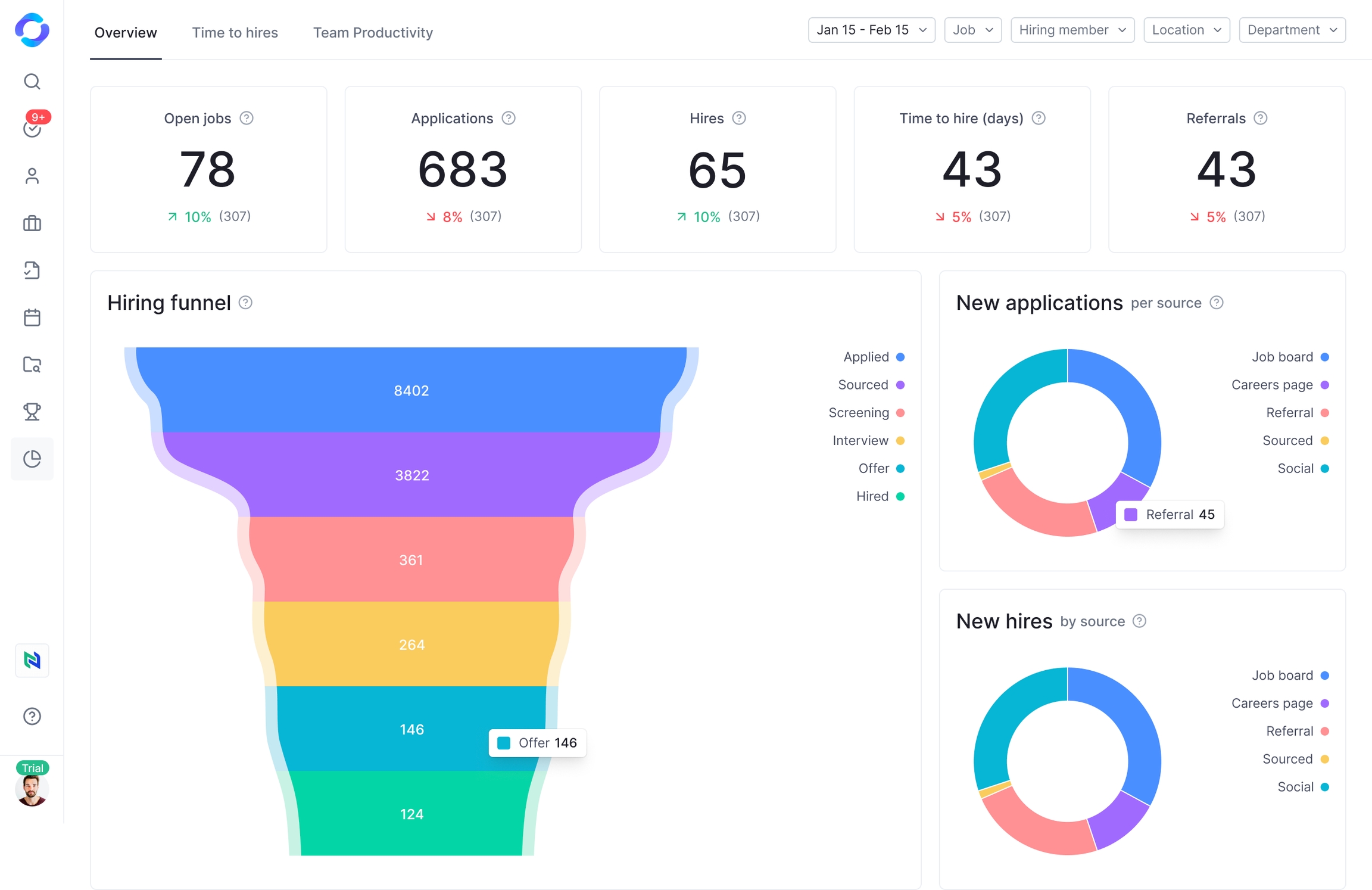 Reports provide a centralized view of your hiring process data. This allows you to easily track and analyze key metrics: Time to Hire, Team productivity helping you optimize your recruitment efforts.