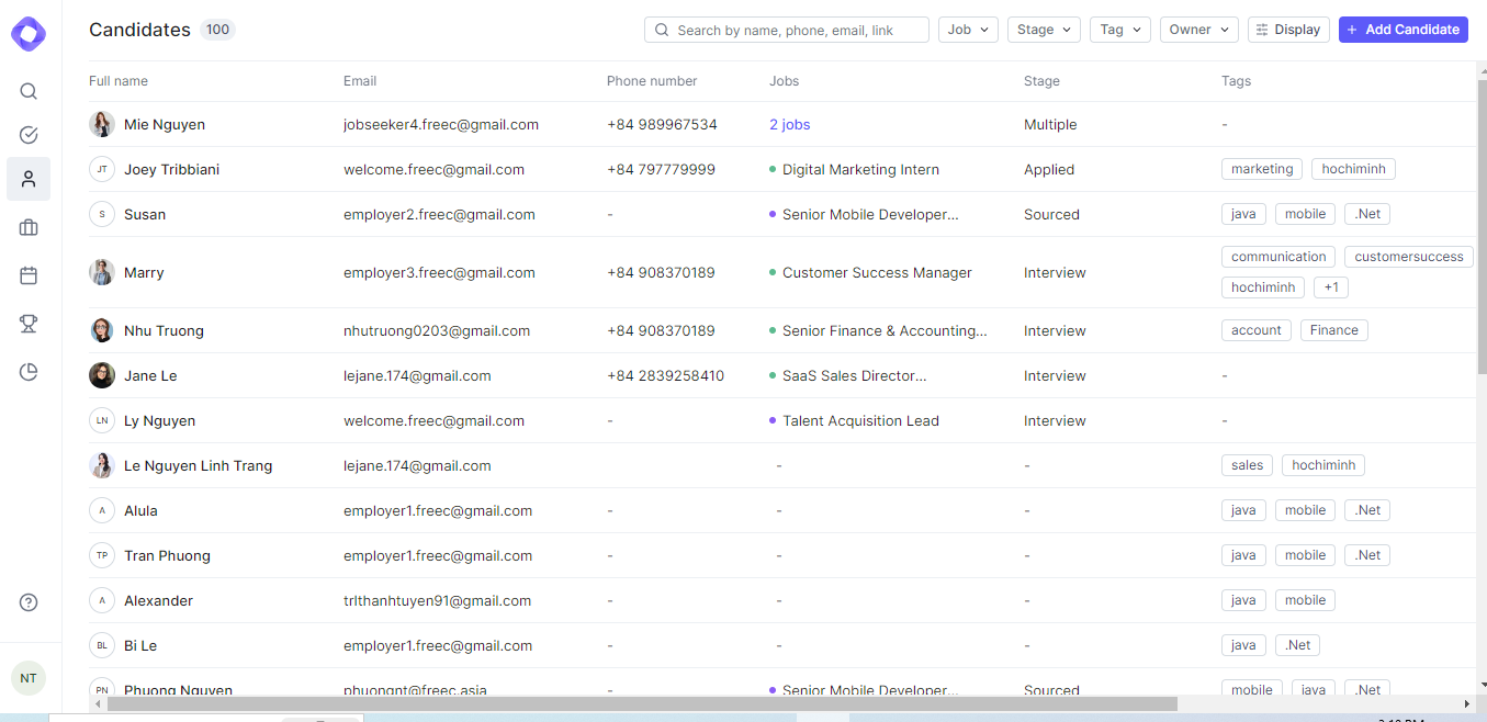 The Candidate Listing provides a centralized view of all applicants for managing potential hires. Here you can:
