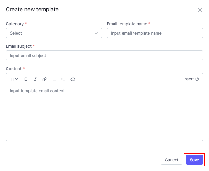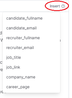 * **Content**: The body of the email sent to candidates. Using the button to format text: heading, **bold**, *italic*, hyperlinks, bulleted lists, numbered lists, and clear format. You can use personalization by click **insert**&#x20;