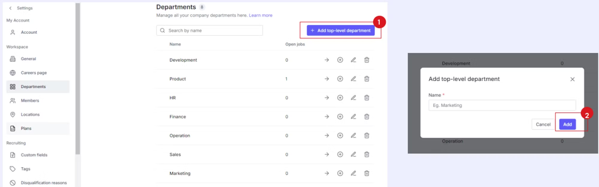 Click the +Add top-level department button.