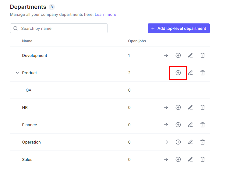 Click the Plus icon on the Department that you need to add a sub-department.