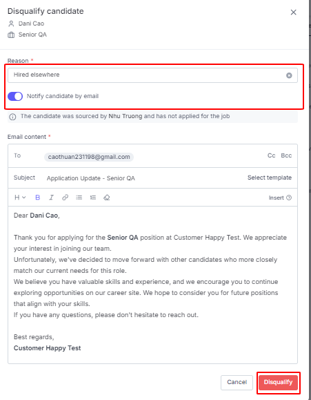 5. You may enable button **Notify the candidate by email** if you want to send a notification email to the Candidate. It's disable as default.