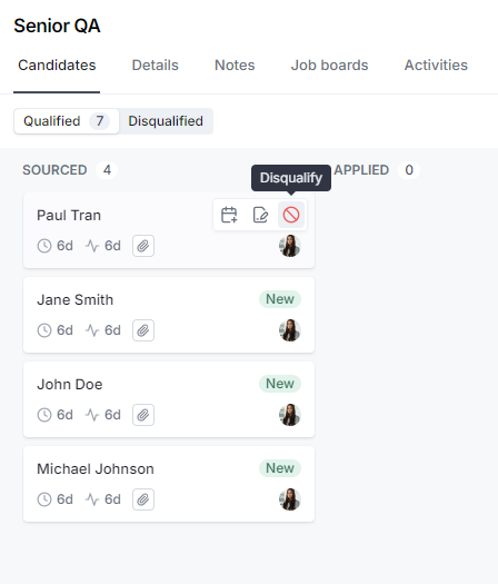 1. Hover your cursor over a candidate card that you need to disqualify.