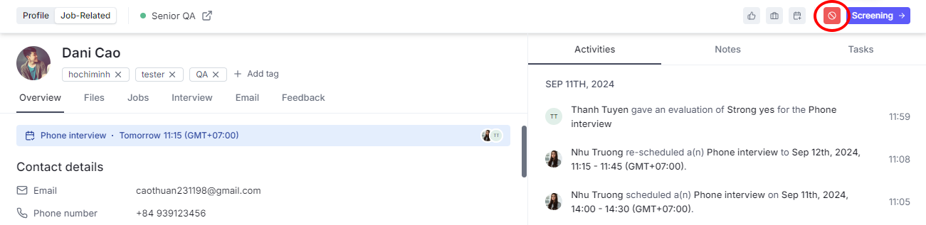 1. Open the candidate profile that you need to disqualify then go to the Job-Related tab.
