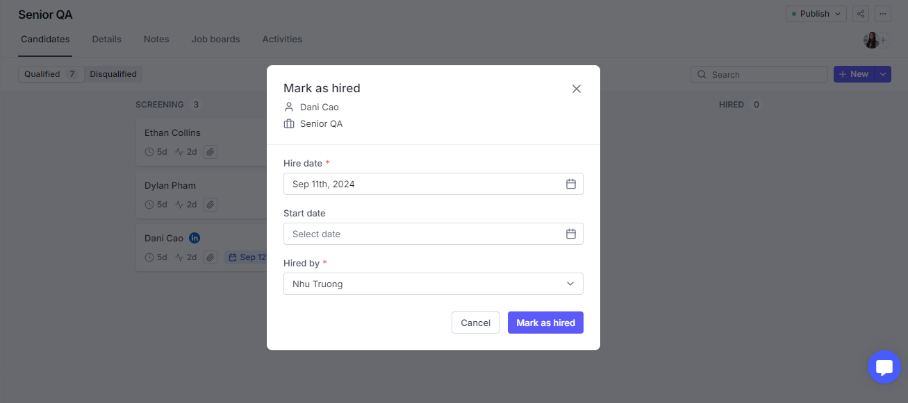 There will be a pop-up when you move the candidate to the Hired stage. You need to fill in the following information, then click **Mark as hired** to complete: