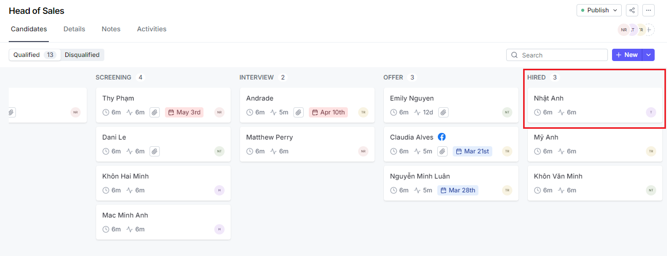 1. At the job pipeline, drag and drop the application need moving to the **Hired** stage.