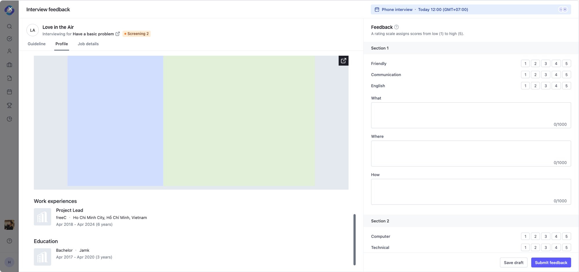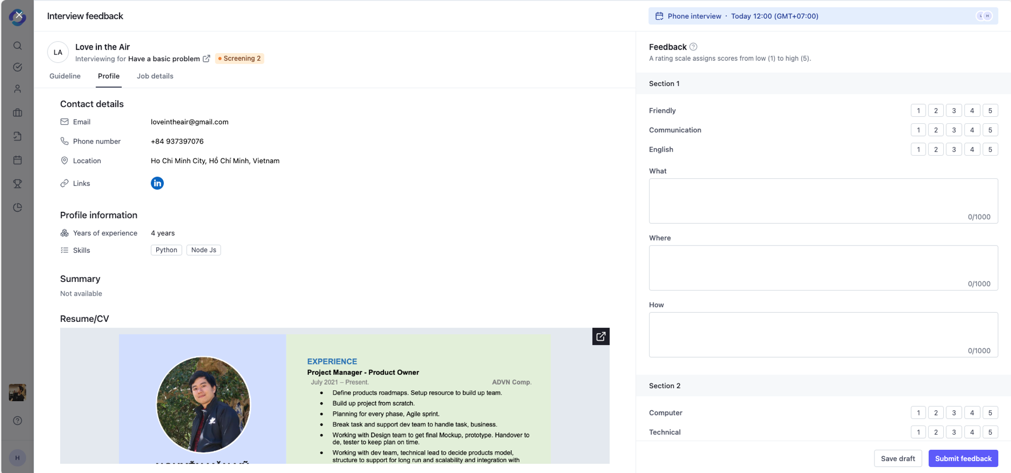 After an interview, when you click **Submit feedback** on a profile, if the candidate have no data of CV or Guideline: