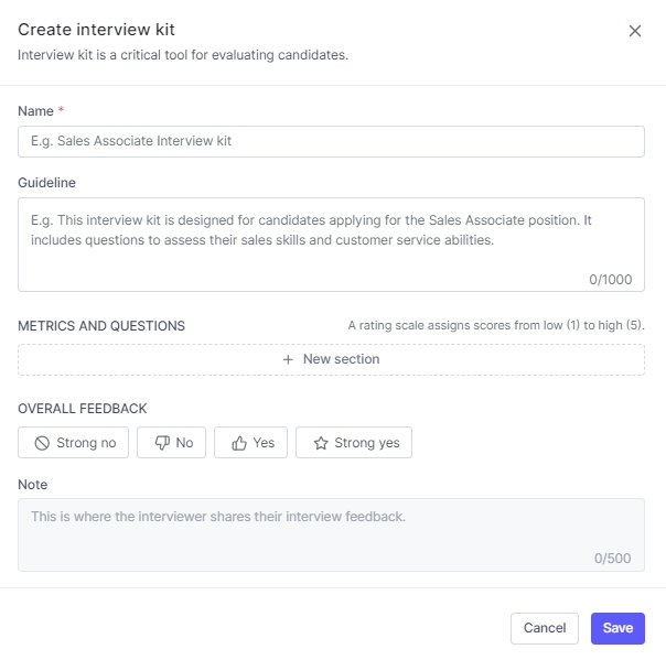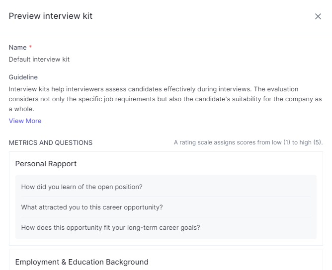 Interview kits are divided into multiple sections to provide a structure for interviews and standardize feedback for easier review.