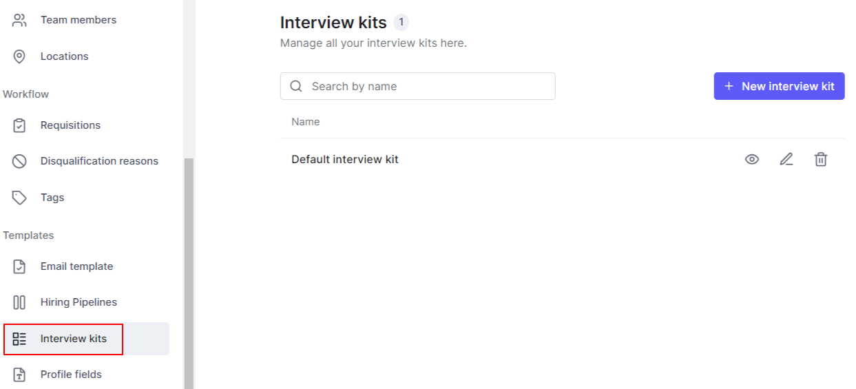 Users with an **Admin role** can create, edit, or delete an interview kit template by clicking the **Interview Kits** in the Settings page