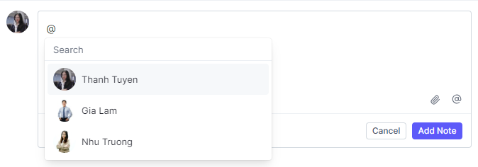 Mention team members by typing or clicking “@” and selecting a name from the drop-down list. Only the members of the hiring team for that job and Administrators will appear.