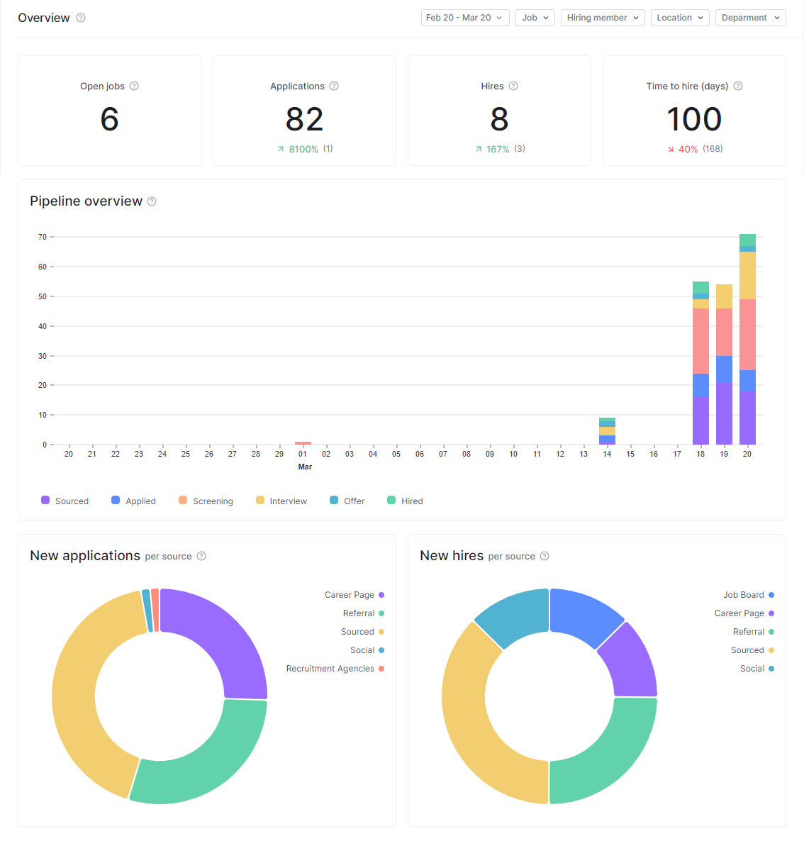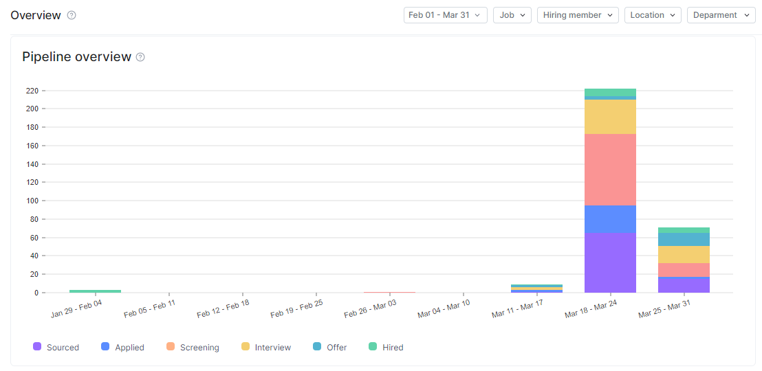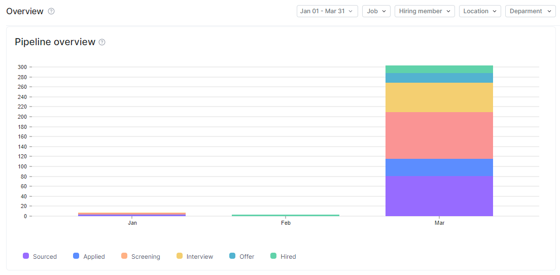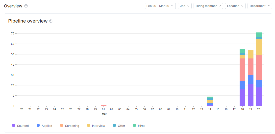 This chart shows the number of applicants who have passed through the stages of the hiring pipeline during the filtering period.&#x20;
