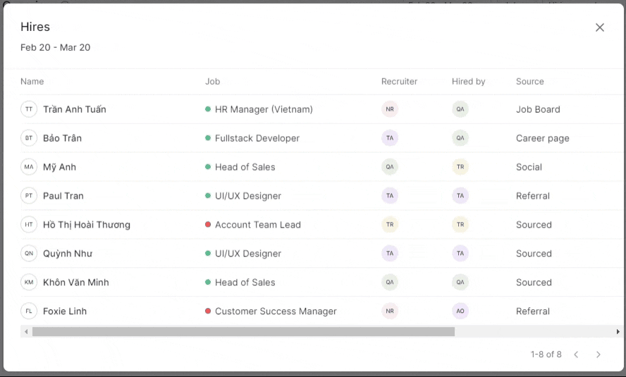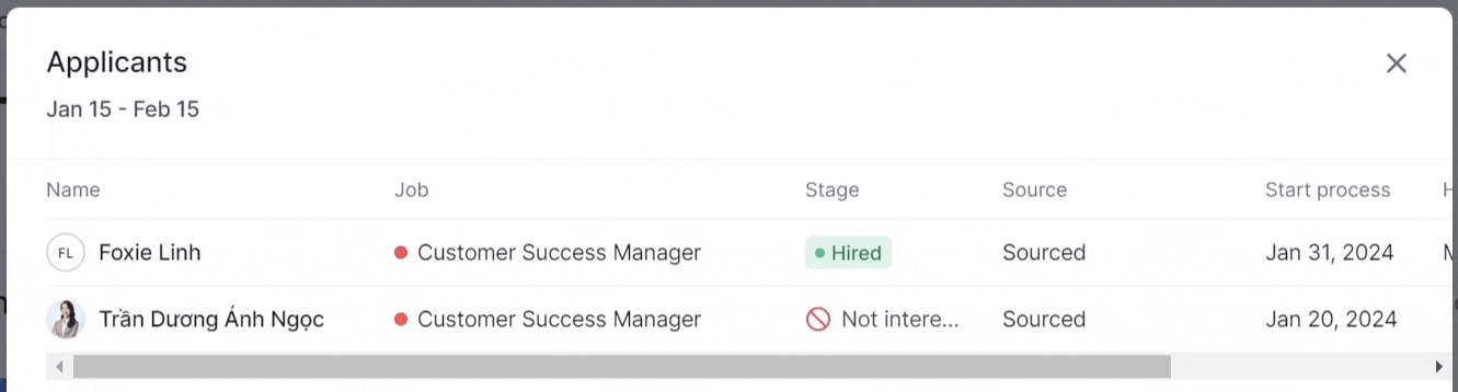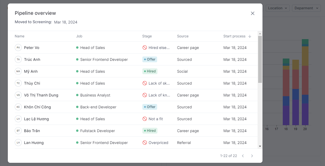 Clicking on a stage from each column in the chart, it will display a table with detailed information about the candidates who have gone through or are currently in that stage.&#x20;