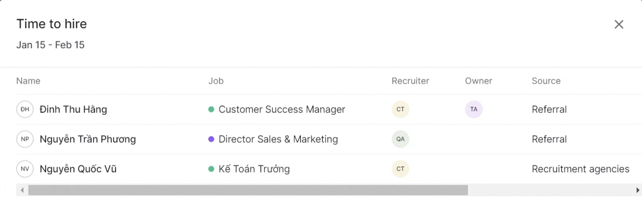 For details on **Time to hire**, click the numeric value, and a table will display the relevant information: