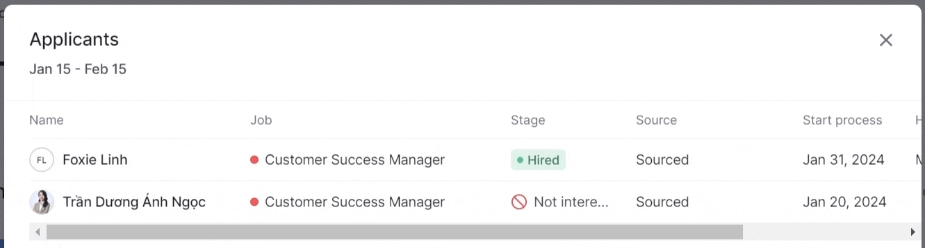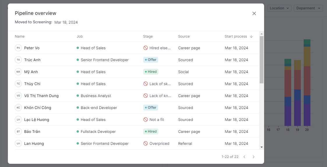 Clicking on a stage from each column in the chart, it will display a table with detailed information about the candidates who have gone through or are currently in that stage.
