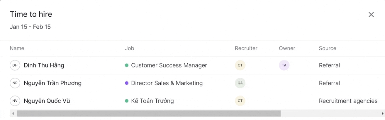 For details on Time to hire, click the numeric value, and a table will display the relevant information: