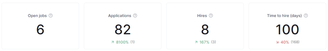 This metric represents the number of applicants who enter your hiring pipeline (New Stage), which includes both Applied or Sourced stage within the chosen time range. Note: Based on applicants who moved to the Hire stage within the selected time range.