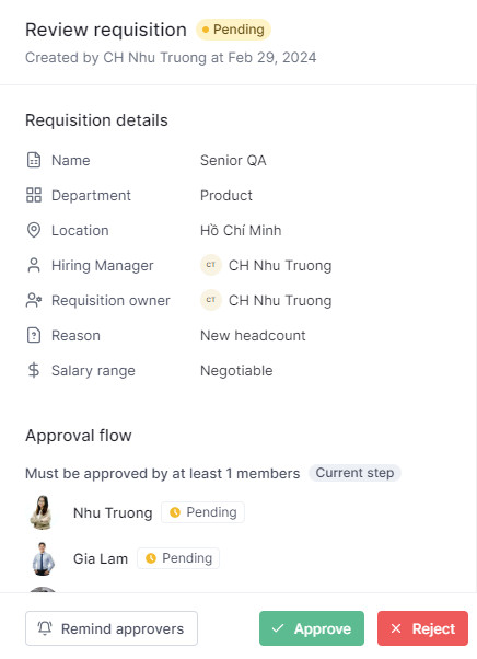 The approvers get notified by email once a requisition needs reviews and they can approve the details or reject them with a note if an update is required.
