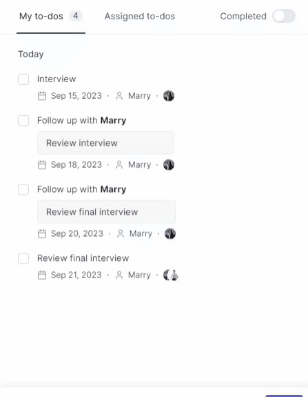 You can create, follow up, and manage tasks related to the hiring process. You can easily assign specific tasks to team members, set due dates, and also link them to specific candidates or job so they don't get forgotten.