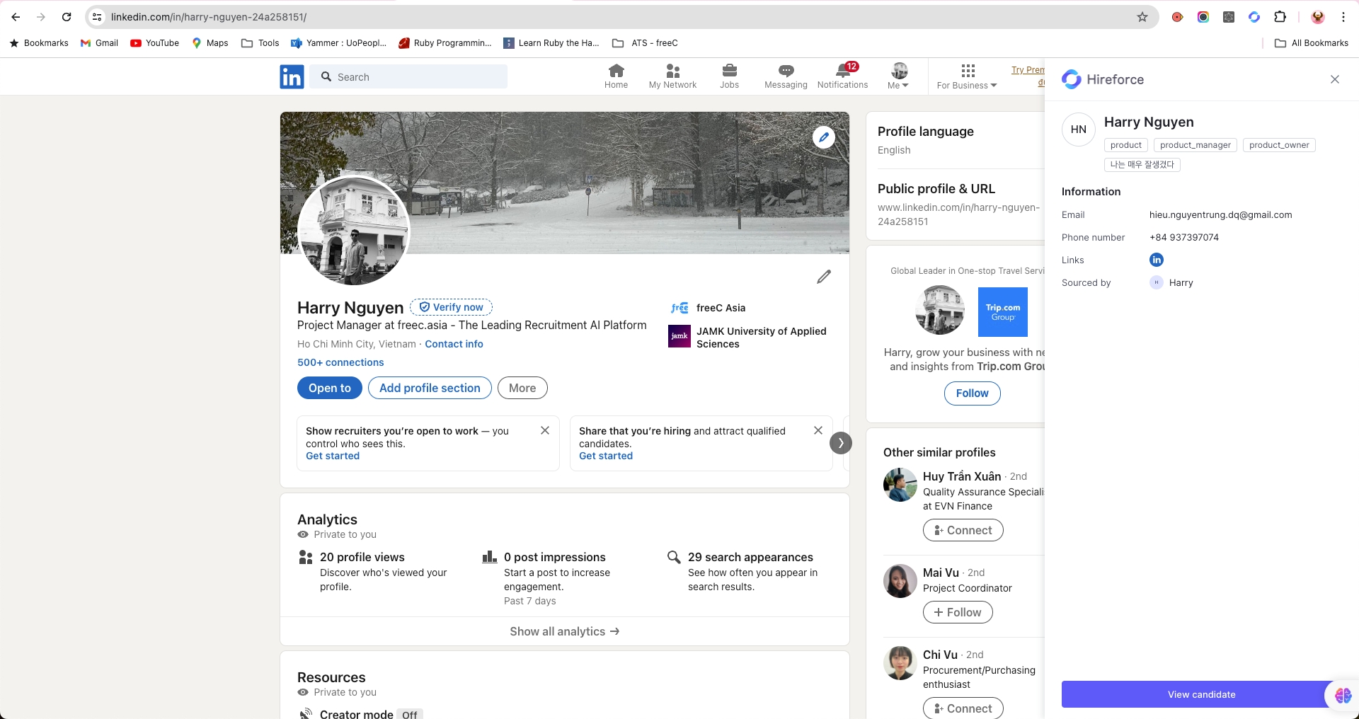 Click the Hireforce Sourcing icon on the toolbar list to crawl the profile from linked-in to your Hireforce account.